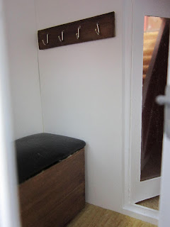 I made a little chest with a seat on which I imagine the little inhabitants of this house sitting on to put on their shoes. You've seen the fabric I used on the top here and here. That stuff was a good buy.
